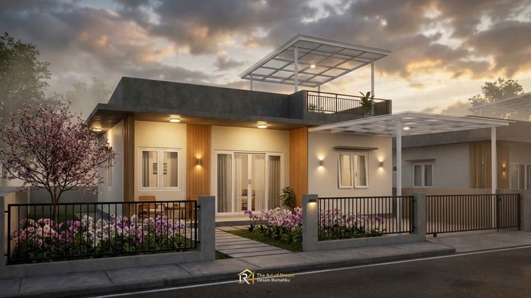 Pemanfaatan lahan yang efisien sangat krusial. Area carport didesain untuk menampung kendaraan dengan aman, menggunakan kanopi berbahan tempered glass atau alderon yang tidak membuat area bawahnya gelap. Di sisi halaman, konsep dry garden atau taman kering dengan tanaman Sansevieria bisa menjadi solusi minim perawatan namun tetap hijau dan asri, mendukung konsep Rumah Minimalis 1 Lantai.