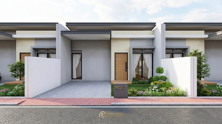 3. Hunian ini merupakan perwujudan sempurna dari rumah tropis modern yang adaptif terhadap iklim Indonesia. Keberadaan taman depan yang hijau dan asri berfungsi sebagai paru-paru rumah, memberikan sirkulasi udara segar serta meredam panas matahari secara efektif. Penggunaan jendela kaca berukuran besar dan tinggi dirancang khusus untuk memaksimalkan ventilasi silang (cross ventilation), sehingga suhu di dalam ruangan tetap sejuk tanpa ketergantungan penuh pada pendingin ruangan. Penempatan tanaman hias yang bervariasi di area depan menciptakan lingkungan mikro yang tenang dan nyaman. Desain atap modern dengan kemiringan tersembunyi juga memastikan pembuangan air hujan mengalir dengan lancar, menjaga struktur bangunan tetap awet di tengah cuaca ekstrem sekaligus menjaga keasrian lingkungan sekitar secara berkelanjutan. 🌳