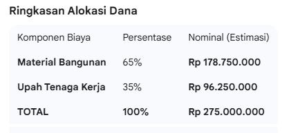 Strategi: Agar masuk budget, spesifikasi material yang digunakan adalah kelas Standar/Menengah, bukan High-End. Anda mungkin perlu melakukan pengawasan ketat agar tidak ada pemborosan material.