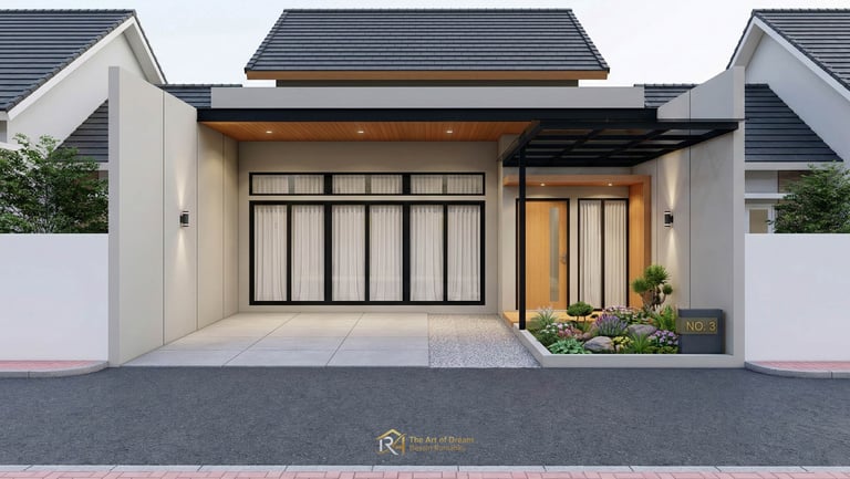 Desain rumah minimalis modern ini menampilkan fasad yang elegan dengan perpaduan tekstur yang sangat kontras namun harmonis. Dinding utama menggunakan warna abu-abu terang yang memberikan kesan lapang, bersih, dan mewah. Penggunaan aksen kayu ulin pada area pintu masuk memberikan sentuhan hangat yang menyeimbangkan dinginnya warna beton. Bagian atap mengombinasikan atap pelana dengan genteng beton hitam matte yang kokoh serta atap datar untuk tampilan kontemporer. Jendela kaca besar dengan bingkai aluminium hitam minimalis memastikan pencahayaan alami maksimal, sementara gorden putih di dalamnya menambah privasi sekaligus mempercantik interior saat dilihat dari luar bangunan hunian premium ini.