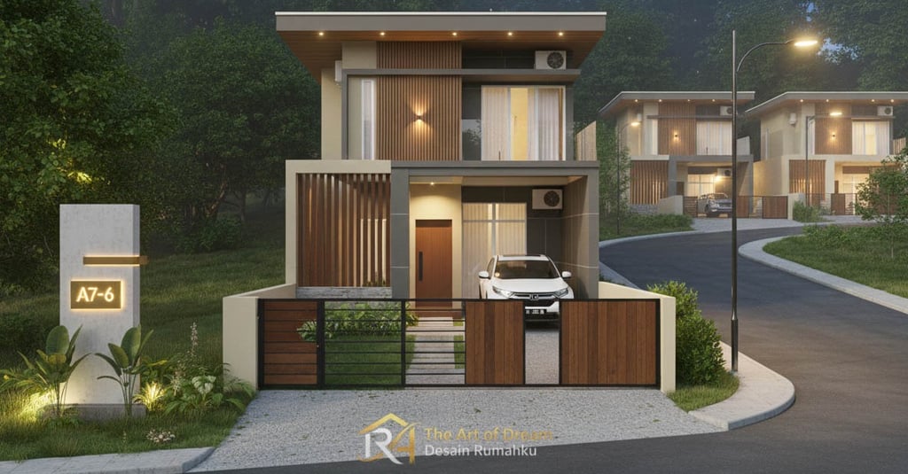 Keunikan desain rumah ini diperkaya dengan panel kayu vertikal yang mempercantik dinding lantai satu, memberikan tekstur alami dan kesan mewah. Monumen balok modern di sisi kiri rumah dengan nomor desain A7-6 berwarna emas menyala menjadi penanda identitas yang menonjol. Sebuah Honda CRV 1.5 Turbo tahun 2023 berwarna putih metalik terparkir rapi di carport, berpadu sempurna dengan estetika rumah.